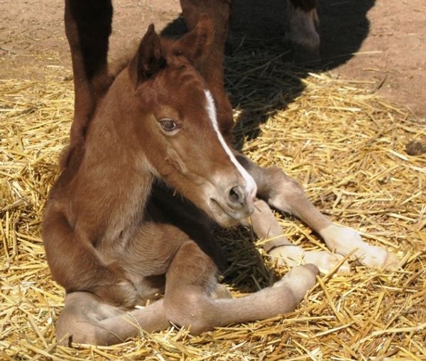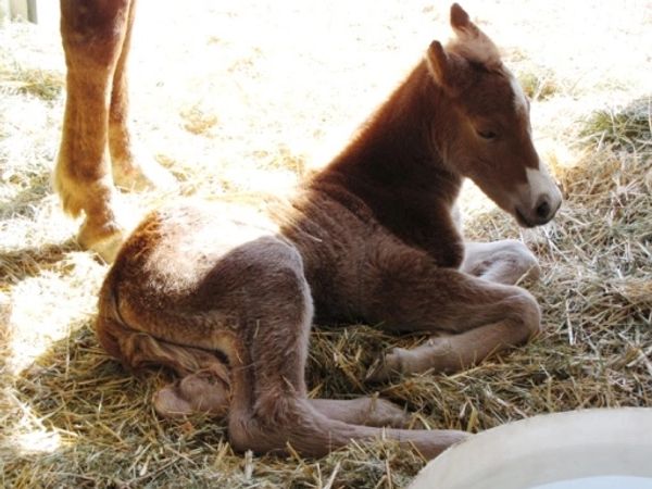 Resting on day 2 outside his stall during his first full day in the run out pen under mom's watchful eye.