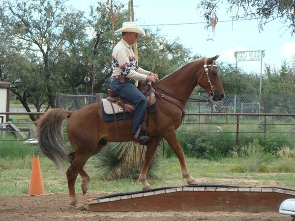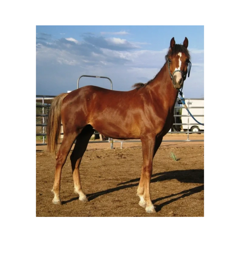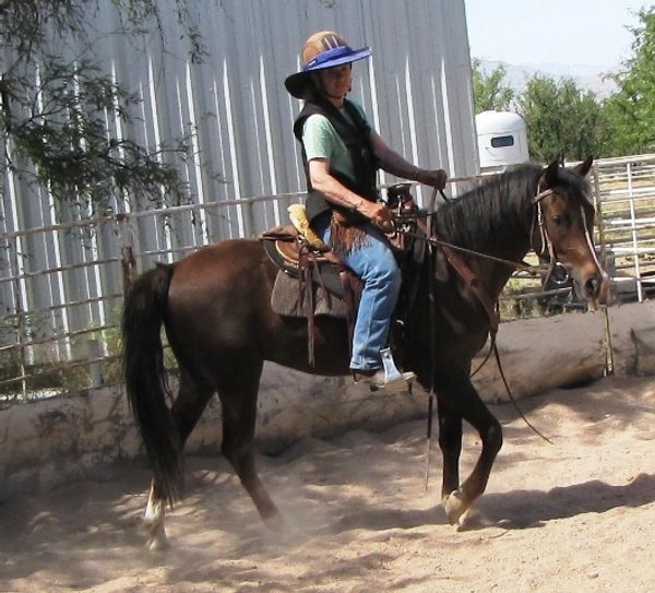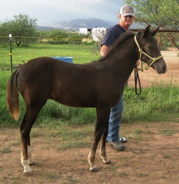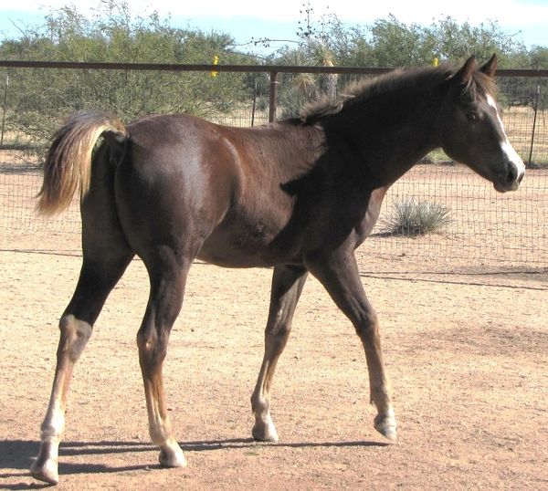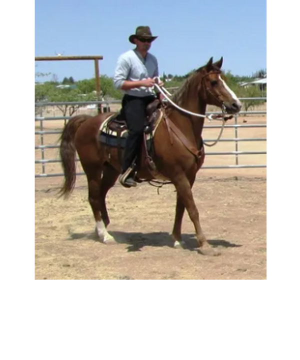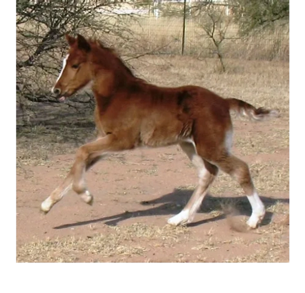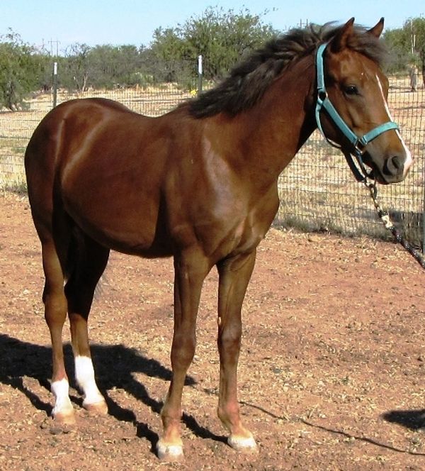 Pistol was foaled by Lil Sister March 15th, 2013 on a windy night at 9:00pm. He's a chestnut and showed gait on day two of his young life. Letha liked the registered name I suggested which is in reference to both his sire Silver Rhythm and his being strongly gaited, and to the windy night he was foaled. She immediately dubbed him "Junior" for his barn name also in reference to his sire, but after a few days of seeing how spunky he was, we changed that to "Pistol". He was trying to get on his feet even before his hind legs were all the way out of mom. By four hours old, he was hopping around the foaling stall like a jack rabbit. He's not shy either, by his second day he was leading his mom out the door of the stall when it was opened and all over their large run-out pen while he explored the big world outside. He loved his large ball he got a few days later too; he climbed on it and pushed it all over the turn-out and in and out of the stall driving his mom crazy. Later in life he started climbing anything he could find; Letha once left his stall door open briefly while getting his mash bucket out of the feed room and when she came back to his stall he was missing. She turned around when she heard a noise and he was in the stall across the barn aisle from his where hay was stacked six levels high and he was standing on the fourth level eating hay off the top level. He loved to play and explore and had no fear, always in your pocket, and would bring you his jolly ball and drop it at your feet so you'd throw it and he could fetch it like a dog. He was sold to a lady who loved his playful attitude, spirit, and strong gait. He now summers in Colorado and winters in Arizona.