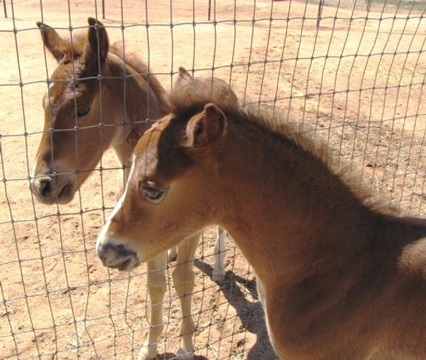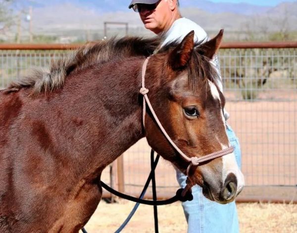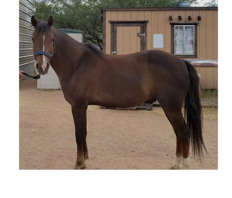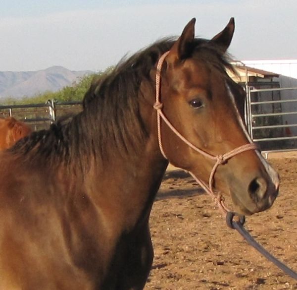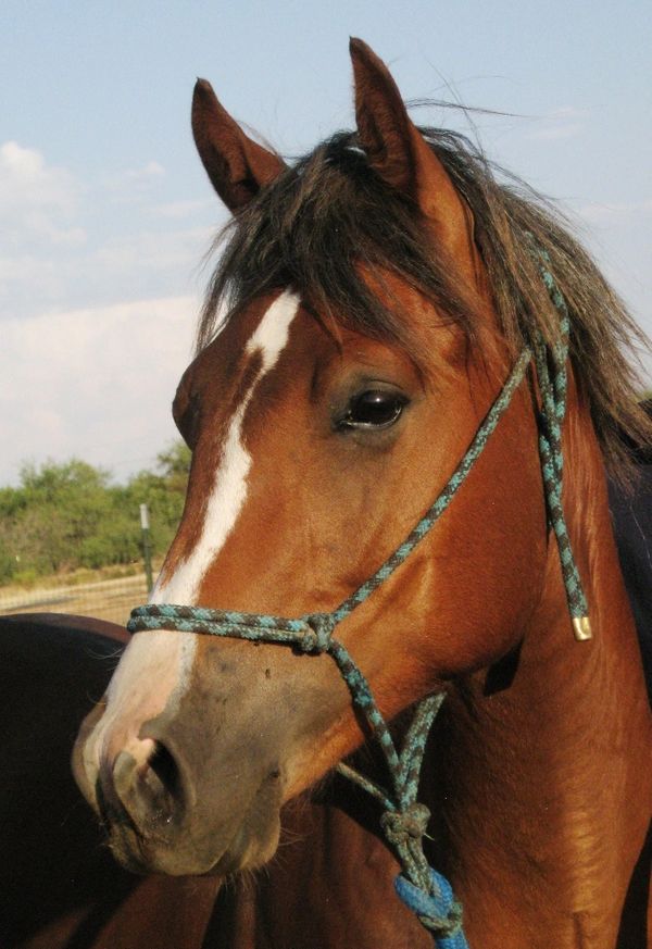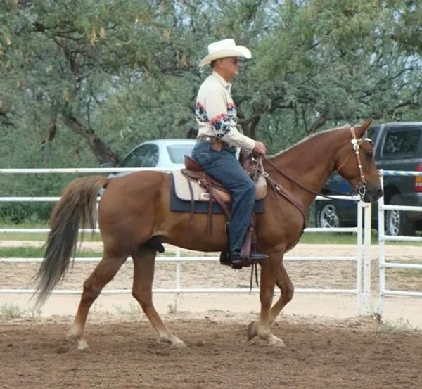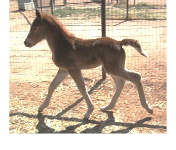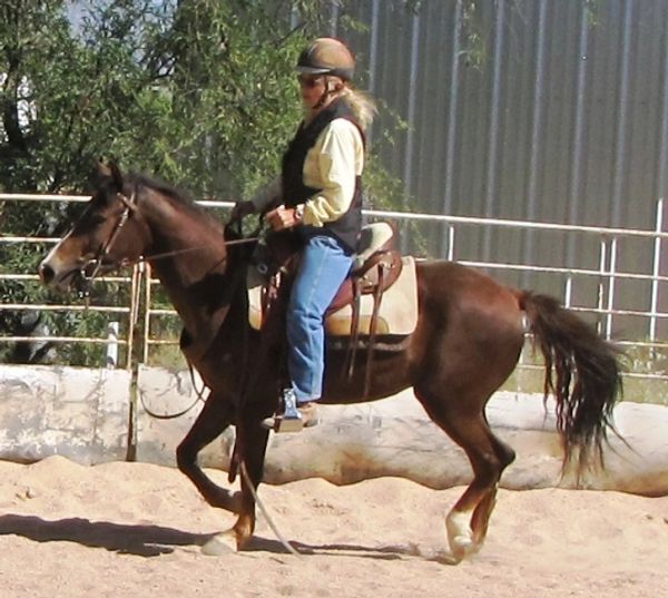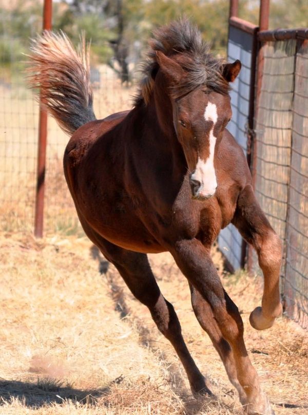 Pistol was foaled by Lil Sister March 15th, 2013 on a windy night at 9:00pm. He's a chestnut and showed gait on day two of his young life. Letha liked the registered name I suggested which is in reference to both his sire Silver Rhythm and his being strongly gaited, and to the windy night he was foaled. She immediately dubbed him "Junior" for his barn name also in reference to his sire, but after a few days of seeing how spunky he was, we changed that to "Pistol". He was trying to get on his feet even before his hind legs were all the way out of mom. By four hours old, he was hopping around the foaling stall like a jack rabbit. He's not shy either, by his second day he was leading his mom out the door of the stall when it was opened and all over their large run-out pen while he explored the big world outside. He loved his large ball he got a few days later too; he climbed on it and pushed it all over the turn-out and in and out of the stall driving his mom crazy. Later in life he started climbing anything he could find; Letha once left his stall door open briefly while getting his mash bucket out of the feed room and when she came back to his stall he was missing. She turned around when she heard a noise and he was in the stall across the barn aisle from his where hay was stacked six levels high and he was standing on the fourth level eating hay off the top level. He loved to play and explore and had no fear, always in your pocket, and would bring you his jolly ball and drop it at your feet so you'd throw it and he could fetch it like a dog. He was sold to a lady who loved his playful attitude, spirit, and strong gait. He now summers in Colorado and winters in Arizona.